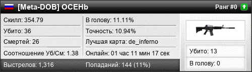 | de_nuke | 11 | 1.83 | 0.43 | 3 | 15 | 00:25:25 | 26.04.2020 | |