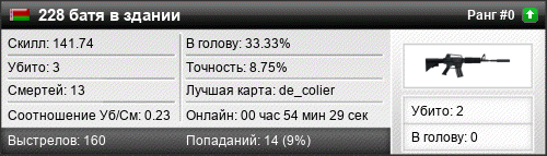 | 19.05.2020 @ 20:24 - 20:28 | de_mari | 00:03:46 | 1 | 3 | 0 | 0.00% | 14.29% | 141.74 |