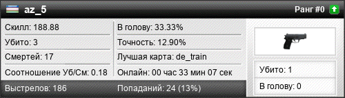 | 23.05.2020 @ 13:27 - 13:37 | de_train | 00:10:38 | 1 | 4 | 0 | 0.00% | 12.20% | 188.88 |