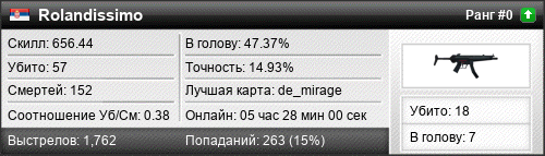 | de_dust2 | 9 | 0.90 | 0.34 | 2 | 17 | 00:26:33 | 07.07.2020 | |