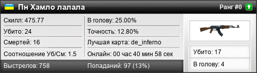 | de_inferno | 24 | 1.50 | 0.59 | 2 | 22 | 00:40:58 | 11.06.2020 | |