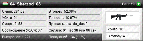 | de_dust2 | 11 | 0.41 | 0.24 | 5 | 42 | 00:46:25 | 18.06.2020 | |
