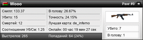 | de_inferno | 9 | 1.80 | 0.91 | 1 | 6 | 00:09:56 | 20.10.2015 | |