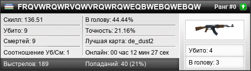 | de_dust2 | 7 | 1.17 | 0.84 | 1 | 9 | 00:08:18 | 01.08.2020 | |