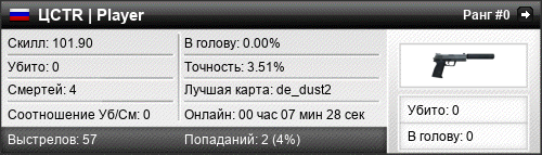 | 25.08.2020 @ 17:48 - 17:49 | de_dust20022 | 00:01:38 | 0 | 0 | 0 | 0.00% | 0.00% | 101.90 |
