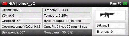 | de_inferno | 3 | 0.23 | 0.10 | 1 | 19 | 00:28:56 | 05.08.2020 | |