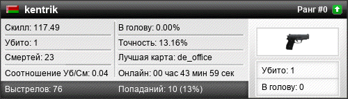 | 28.08.2020 @ 17:12 - 17:39 | de_office | 00:27:09 | 1 | 14 | 0 | 0.00% | 12.31% | 119.50 |