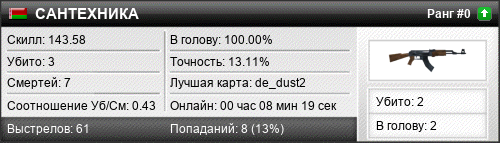 | 13.09.2020 @ 11:27 - 11:28 | de_assault | 00:01:17 | 0 | 2 | 0 | 0.00% | 16.67% | 144.04 |