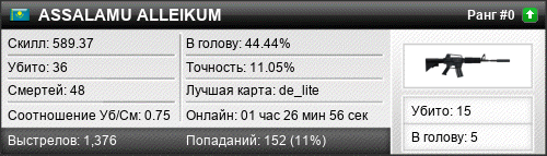 | 13.09.2020 @ 19:32 - 20:15 | de_mirage | 00:43:17 | 13 | 22 | 5 | 38.46% | 9.67% | 550.39 |