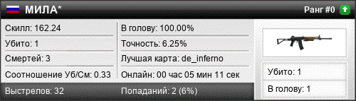 | de_inferno | 1 | 0.33 | 0.19 | 2 | 4 | 00:05:11 | 25.09.2020 | |