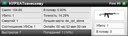| de_cpl_stone | 1 | 1.00 | 0.50 | 1 | 1 | 00:02:00 | 08.11.2020 | |