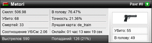 | 04.04.2017 @ 07:01 - 07:07 | de_nuke | 00:05:43 | 1 | 2 | 0 | 0.00% | 5.88% | 107.03 |