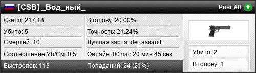 | de_assault | 5 | 0.62 | 0.33 | 1 | 10 | 00:15:08 | 26.11.2020 | |