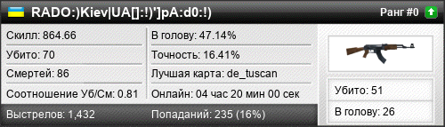 | de_inferno | 6 | 0.75 | 0.28 | 2 | 18 | 00:21:09 | 10.01.2021 | |