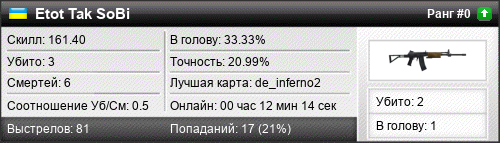 | de_inferno2 | 3 | 0.50 | 0.25 | 1 | 6 | 00:12:14 | 29.01.2021 | |