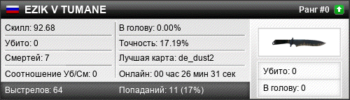 | de_dust2 | 0 | 0.00 | 0.00 | 1 | 7 | 00:09:53 | 06.01.2016 | |