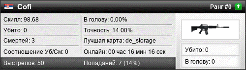 | 10.10.2019 @ 16:24 - 16:28 | de_aztec | 00:03:57 | 0 | 3 | 0 | 0.00% | 14.00% | 98.68 |