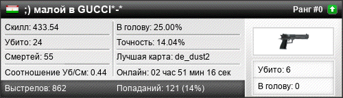 | de_dust2 | 10 | 0.56 | 0.33 | 2 | 22 | 00:30:39 | 06.03.2021 | |