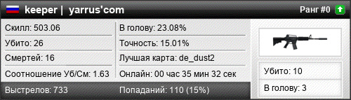 | de_dust2 | 23 | 2.09 | 0.83 | 6 | 19 | 00:27:50 | 08.03.2021 | |