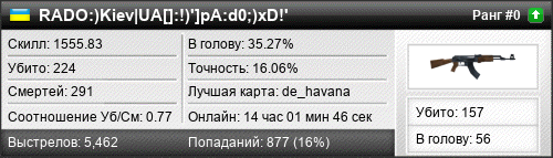 | de_aztec2 | 17 | 1.21 | 0.49 | 1 | 20 | 00:34:21 | 09.03.2021 | |