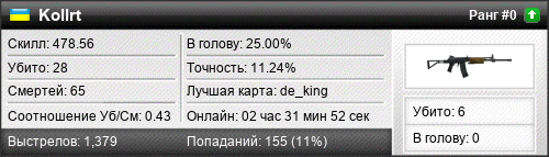 | 24.03.2021 @ 22:35 - 23:01 | de_dubrovicha | 00:26:35 | 0 | 1 | 0 | 0.00% | 10.00% | 445.85 |