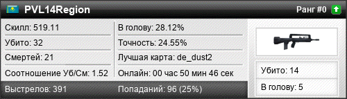 | de_dust2 | 19 | 2.38 | 0.81 | 1 | 18 | 00:23:29 | 25.04.2021 | |