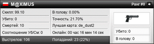 | 23.01.2023 @ 13:54 - 14:02 | de_aztec | 00:07:19 | 0 | 5 | 0 | 0.00% | 25.93% | 99.10 |
