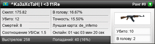 | de_inferno | 9 | 4.50 | 0.92 | 1 | 6 | 00:09:47 | 17.01.2016 | |