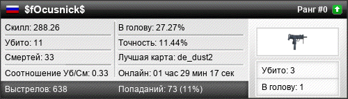 | de_dust2 | 5 | 0.50 | 0.15 | 2 | 23 | 00:33:11 | 26.01.2022 | |
