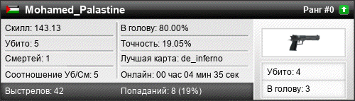 | de_inferno | 3 | 3.00 | 1.21 | 1 | 4 | 00:02:29 | 22.08.2021 | |