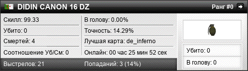 | 14.09.2021 @ 22:39 - 22:44 | de_westwood | 00:04:41 | 0 | 4 | 0 | 0.00% | 14.29% | 99.33 |