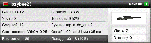 | de_dust2 | 3 | 0.38 | 0.13 | 1 | 12 | 00:22:59 | 30.08.2021 | |
