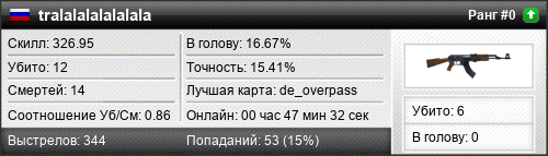 | de_overpass | 5 | 1.00 | 0.56 | 1 | 7 | 00:08:58 | 31.10.2021 | |