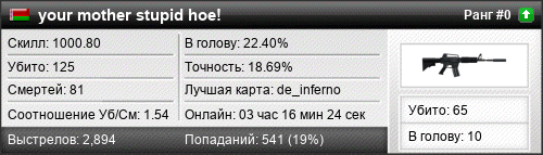 | de_inferno | 19 | 2.38 | 1.18 | 1 | 15 | 00:16:03 | 05.11.2021 | |