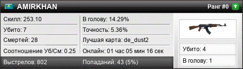 | de_dust2 | 5 | 0.56 | 0.20 | 2 | 23 | 00:25:11 | 30.04.2025 | |