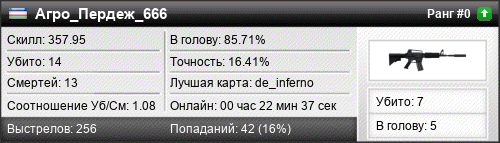 | de_inferno | 14 | 1.08 | 0.62 | 1 | 14 | 00:22:37 | 17.02.2022 | |