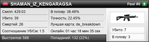 | de_dust2 | 13 | 2.17 | 0.81 | 1 | 15 | 00:16:06 | 11.03.2022 | |