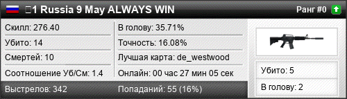 | de_westwood | 8 | 1.60 | 0.55 | 1 | 10 | 00:14:28 | 09.05.2022 | |