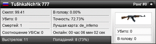 | de_inferno | 0 | 0.00 | 0.00 | 1 | 2 | 00:04:10 | 27.05.2022 | |
