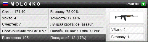 | de_assault | 4 | 0.57 | 0.38 | 1 | 8 | 00:10:32 | 03.07.2022 | |