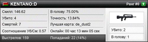 | de_dust2 | 4 | 1.00 | 0.46 | 1 | 6 | 00:08:37 | 12.01.2016 | |