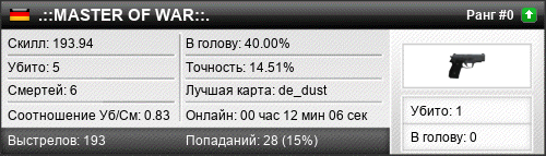 | de_dust | 5 | 1.00 | 0.47 | 1 | 9 | 00:10:44 | 08.11.2022 | |