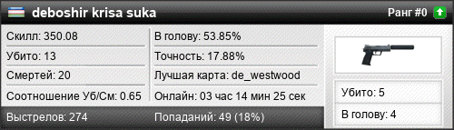 | de_nuke | 0 | 0.00 | 0.00 | 1 | 14 | 00:17:38 | 11.11.2022 | |