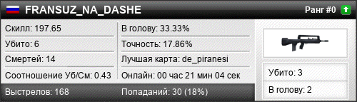 | de_mirage | 1 | 1.00 | 1.33 | 1 | 2 | 00:00:45 | 21.01.2023 | |