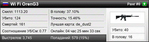 | 22.01.2023 @ 17:49 - 18:27 | de_nuke | 00:38:17 | 11 | 17 | 4 | 36.36% | 9.02% | 1113.20 |