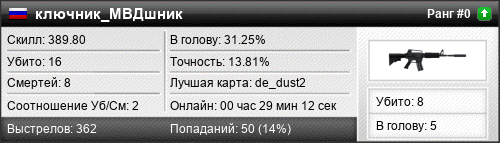 | de_dust2 | 10 | 1.43 | 0.44 | 1 | 13 | 00:22:58 | 02.02.2023 | |