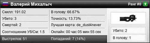 | de_dust4never | 3 | 1.50 | 0.51 | 2 | 4 | 00:05:55 | 03.03.2023 | |