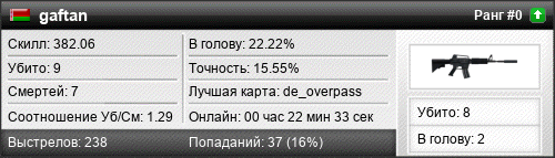 | de_overpass | 9 | 1.29 | 0.40 | 1 | 13 | 00:22:33 | 19.03.2023 | |