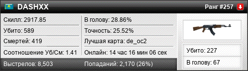 | de_mirage | 16 | 2.29 | 0.94 | 1 | 12 | 00:16:56 | 20.10.2025 | |