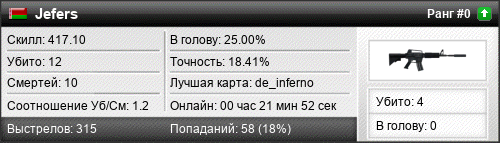 | de_inferno | 12 | 1.20 | 0.55 | 2 | 12 | 00:21:52 | 06.08.2023 | |